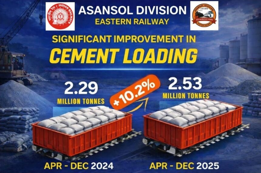 आसनसोल | 06 जनवरी 2026-:पूर्व रेलवे के आसनसोल मंडल ने चालू वित्तीय वर्ष 2025–26 में सीमेंट लोडिंग के क्षेत्र में महत्त्वपूर्ण प्रगति दर्ज की है। अप्रैल से दिसंबर 2025 की अवधि में मंडल द्वारा 2.53 मिलियन टन सीमेंट की लोडिंग की गई, जबकि पिछले वित्तीय वर्ष 2024–25 की इसी अवधि में यह आंकड़ा 2.29 मिलियन टन था। इस प्रकार सीमेंट लोडिंग में 10.2 प्रतिशत की वृद्धि दर्ज की गई है।