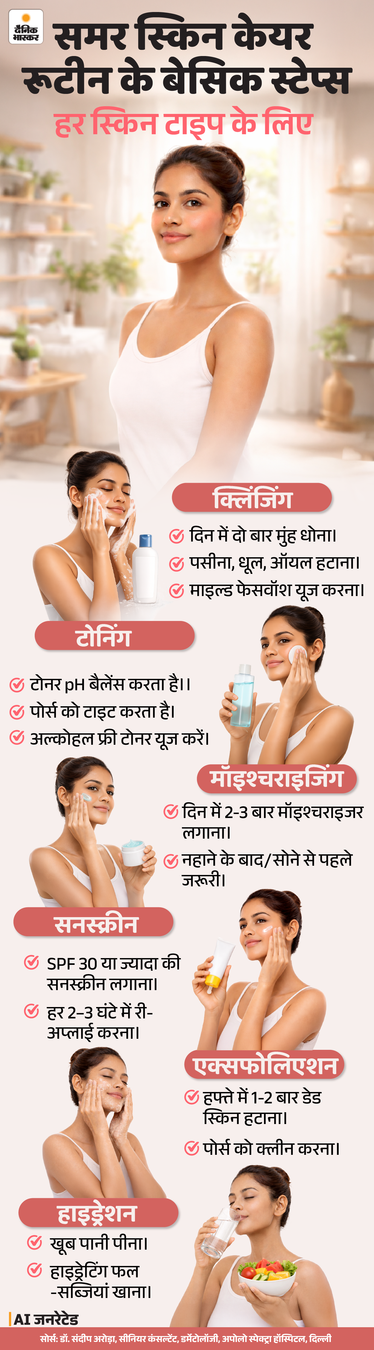 जवाब- समर स्किन केयर रूटीन के बेसिक स्टेप्स नीचे ग्राफिक में देखें-