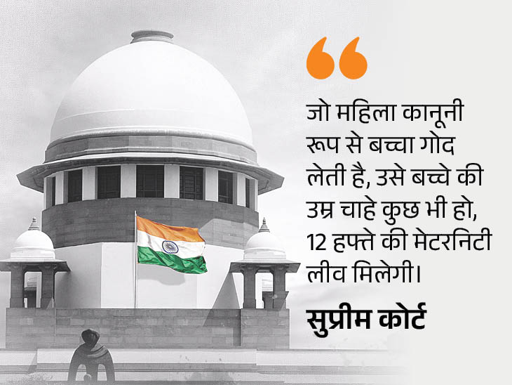 सुप्रीम कोर्ट ने मंगलवार को कहा कि अब किसी भी उम्र के बच्चे को गोद लेने वाली महिला को 12 हफ्ते की छुट्टी मिलेगी। सिर्फ 3 महीने से कम उम्र के बच्चे को गोद लेने पर ही छुट्टी देना गलत है।