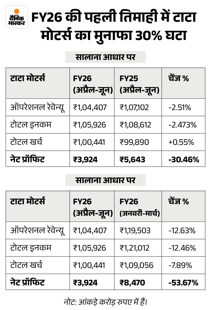 ऑटोमोबाईल कंपनी टाटा मोटर्स को वित्त वर्ष 2025-26 की पहली तिमाही में 3,924 करोड़ रुपए का शुद्ध मुनाफा (कॉन्सोलिडेटेड नेट प्रॉफिट) हुआ है। सालाना आधार पर यह 30% कम रहा है। एक साल पहले की समान तिमाही में कंपनी का मुनाफा 5,643 करोड़ रुपए था।