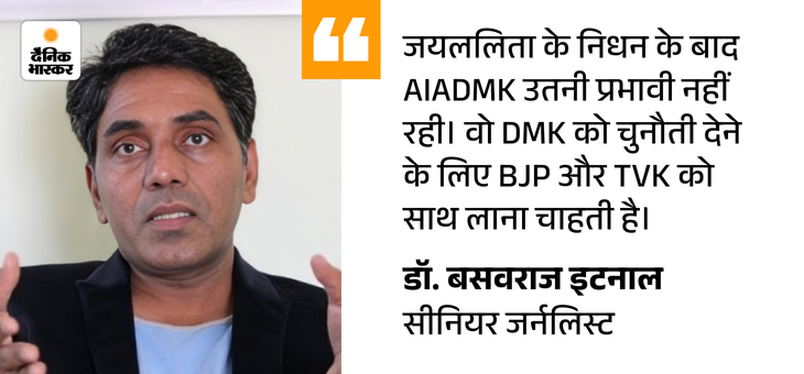 एक्सपर्ट बोले- BJP और विजय की दोस्ती से AIADMK को नुकसान तमिलनाडु और साउथ की पॉलिटिक्स पर 25 साल से नजर रख रहे पॉलिटिकल एनालिस्ट टीएस सुधीर कहते हैं, ‘विजय महज 10 या 20 सीटों के लिए NDA में नहीं आएंगे, क्योंकि वे खुद को CM पद का दावेदार मानते हैं। इसलिए वे ज्यादा सीटें मांगेंगे। NDA अगर विजय को अपने साथ लाता है, तो उसे AIADMK के खाते से सीटें देनी पड़ेंगी। सोचने लायक बात है कि क्या एडप्पाडी पलानीस्वामी इस बात के लिए तैयार होंगे? अभी ये बड़ा सवाल होगा।’