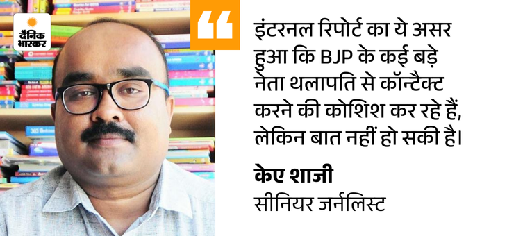 एक इंटरनल रिपोर्ट ने तमिलनाडु BJP को एक्टिव किया तमिलनाडु और केरल विधानसभा चुनाव पर करीब से नजर रख रहे सीनियर जर्नलिस्ट केए शाजी कहते हैं, ‘इलेक्शन से पहले वोटर्स का मूड जानने के लिए कई सर्वे किए गए, जिनमें NDA गठबंधन के लिए बहुत पॉजिटिव तस्वीर पेश नहीं की गई। यही वजह है कि BJP विजय को साथ लाने के लिए हर मुमकिन कोशिश कर रही है।’