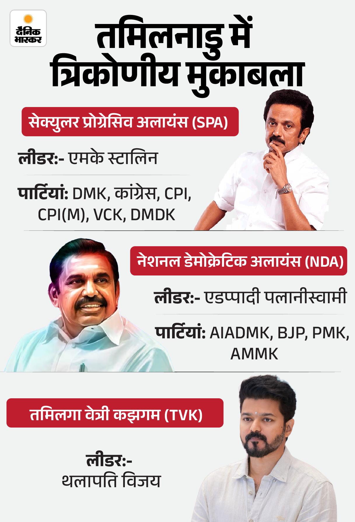 विजय का इम्पैक्ट कम करने के लिए DMK ने कांग्रेस और वामपंथी दलों सहित 23 पार्टियों को अपने अलायंस में शामिल किया है। मुख्यमंत्री स्टालिन की अगुआई वाले SPA का रुख साफ है कि वो विजय के साथ किसी भी सूरत में हाथ नहीं मिलाएंगे। दूसरी तरफ, NDA ब्लॉक में AIADMK, BJP, पट्टाली मक्कल काची (PMK) और AMMK जैसी दूसरी पार्टियां शामिल हैं।