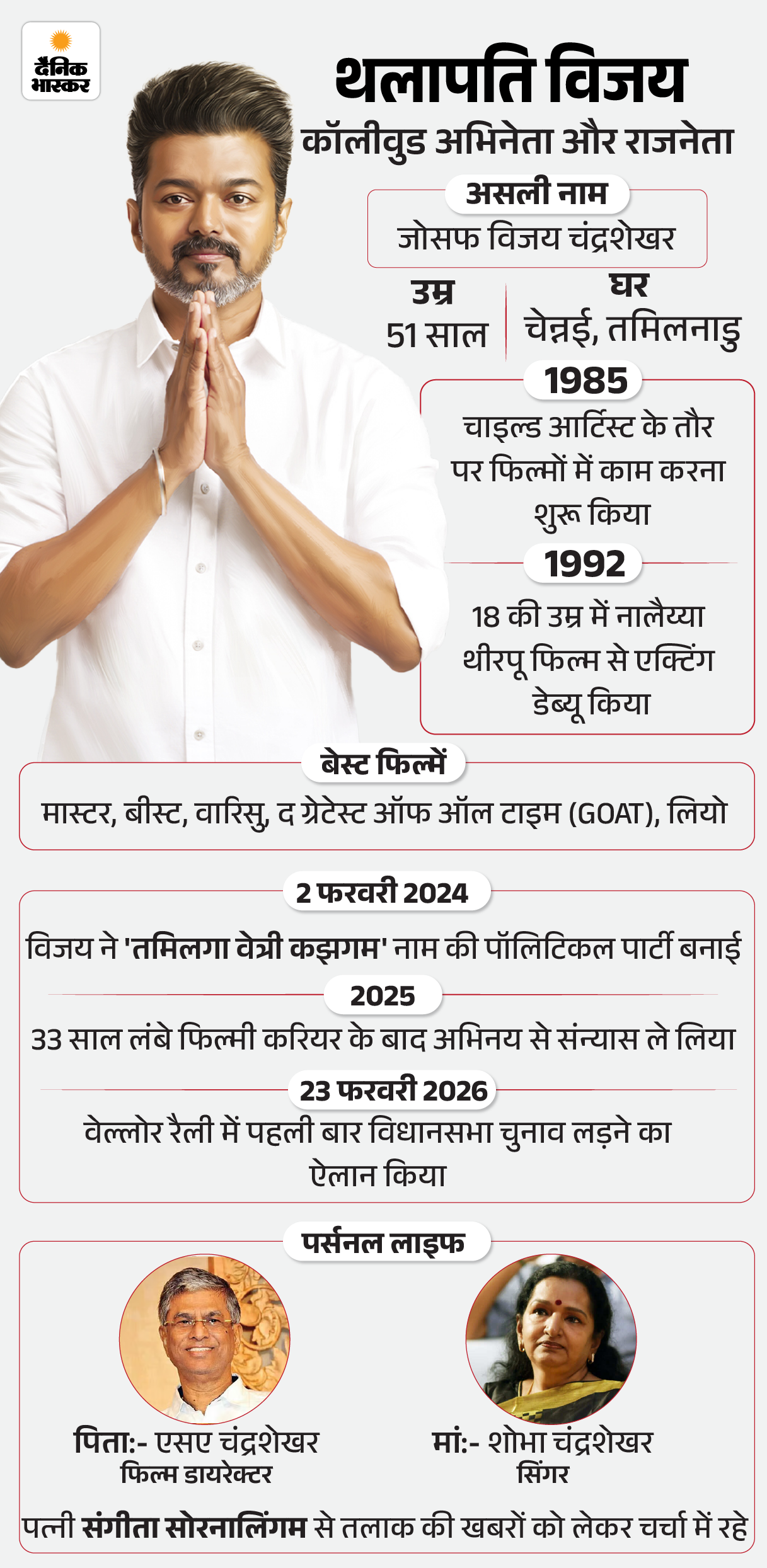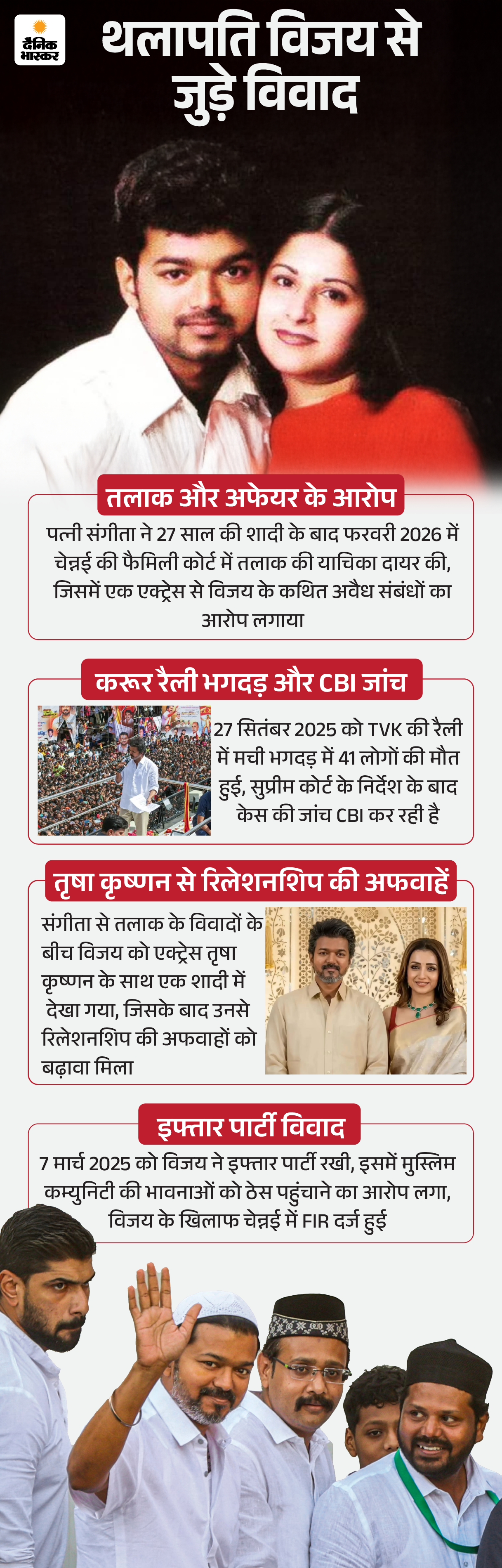 विजय की पर्सनल लाइफ और तलाक DMK के लिए चुनावी मुद्दा तमिलनाडु विधानसभा चुनाव से पहले थलापति विजय से जुड़ा तलाक का विवाद भी राजनीतिक समीकरणों का मुद्दा बना हुआ है। विजय से अलग रह रही उनकी पत्नी संगीता सोरनलिंगम ने दिसंबर 2025 में चेंगलपट्टू कोर्ट में तलाक की याचिका दायर कर गुजारे भत्ते की मांग की थी।