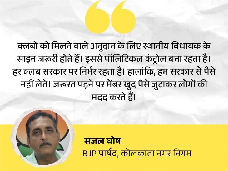 सजल घोष का दावा है कि क्लबों को मिलने वाले अनुदान के लिए स्थानीय विधायक के साइन जरूरी होते हैं। इससे पॉलिटिकल कंट्रोल बना रहता है। हर क्लब सरकार पर निर्भर रहता है। हालांकि, हम सरकार से पैसे नहीं लेते। जरूरत पड़ने पर मेंबर खुद पैसे जुटाकर लोगों की मदद करते हैं।