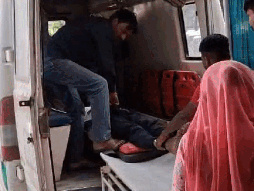 घायल को एम्बुलेंस से बाहर निकालते हुए एम्बुलेंस कर्मी